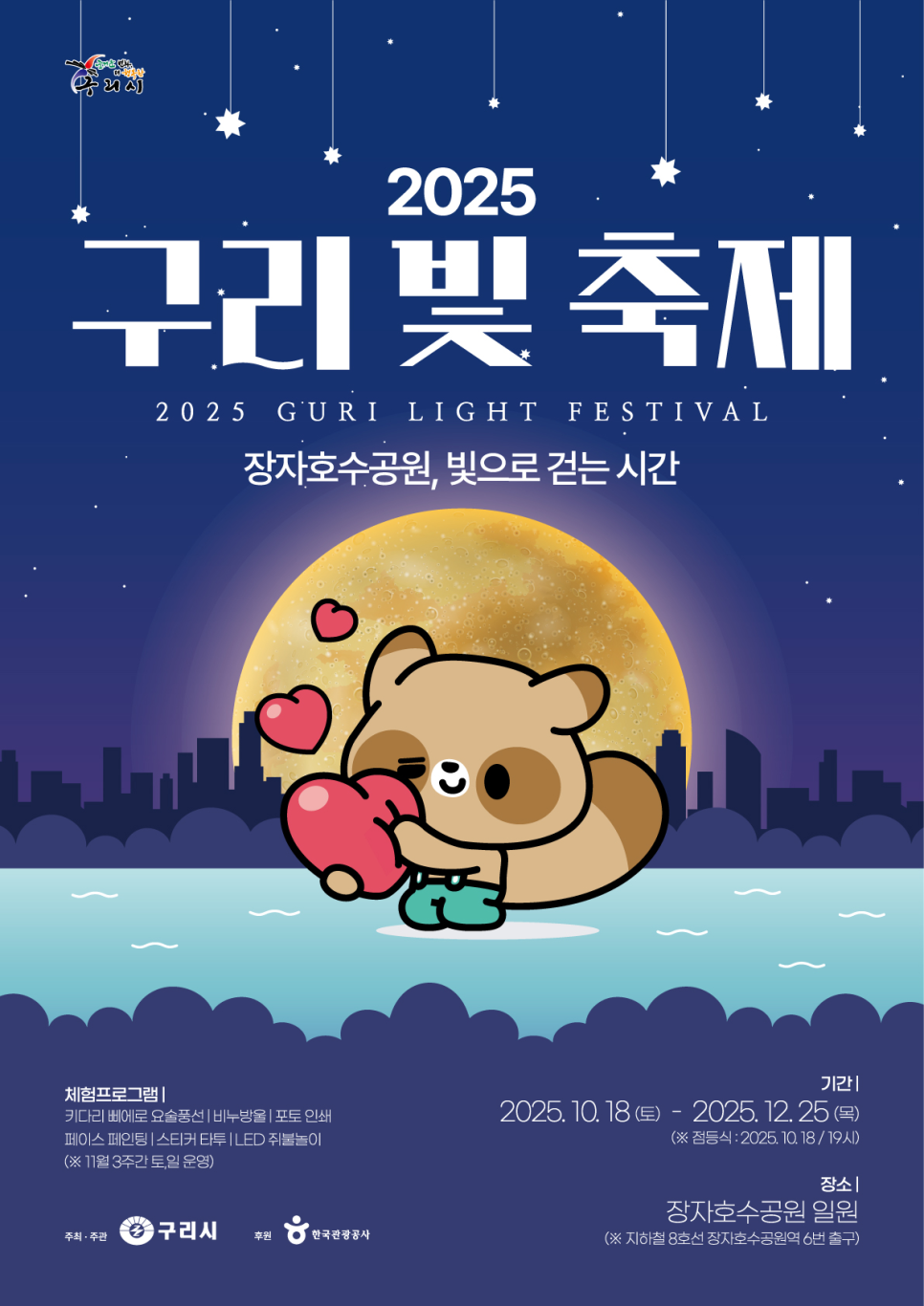 ‘장자호수공원, 빛으로 걷는 시간'을 주제로 장자못 설화와 겨울동화를 결합한 공간 연출로 구리의 밤을 환상적인 빛으로 수놓는 축제이고 화려한 조명과 다양한 작품들로 가득 차 있어, 많은 사람들이 겨울밤의 따뜻한 분위기 속에서 꿈같은 장관을 즐기기 위해 방문합니다. 도심 속 호수공원을 배경으로 빛 조형물과 포토존이 설치되어 있으며, 11월 1~3주 주말에는 페이스 페인팅, LED 쥐불놀이, 비눗방울 체험 등 시민 참여형 프로그램이 운영됩니다. 아울러 장자못 축제, 음악창작소 빛 축제 콘서트 등 다채로운 연계행사도 함께 즐길 수 있습니다.