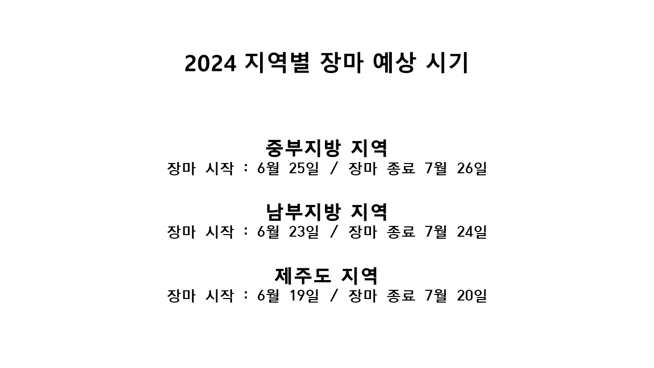 2024년 장마 기간은 6월 말에서 7월 말까지로 예상됩니다. 지역별 장마 예상 기간은 아래와 같습니다.